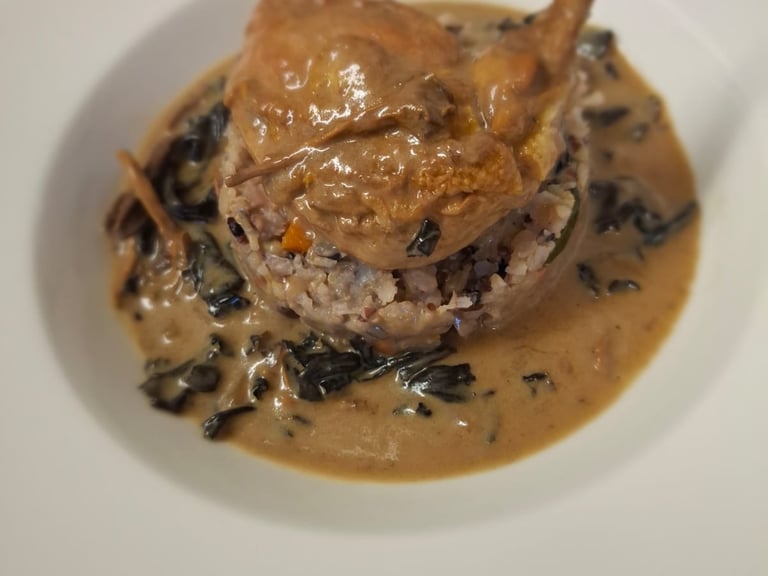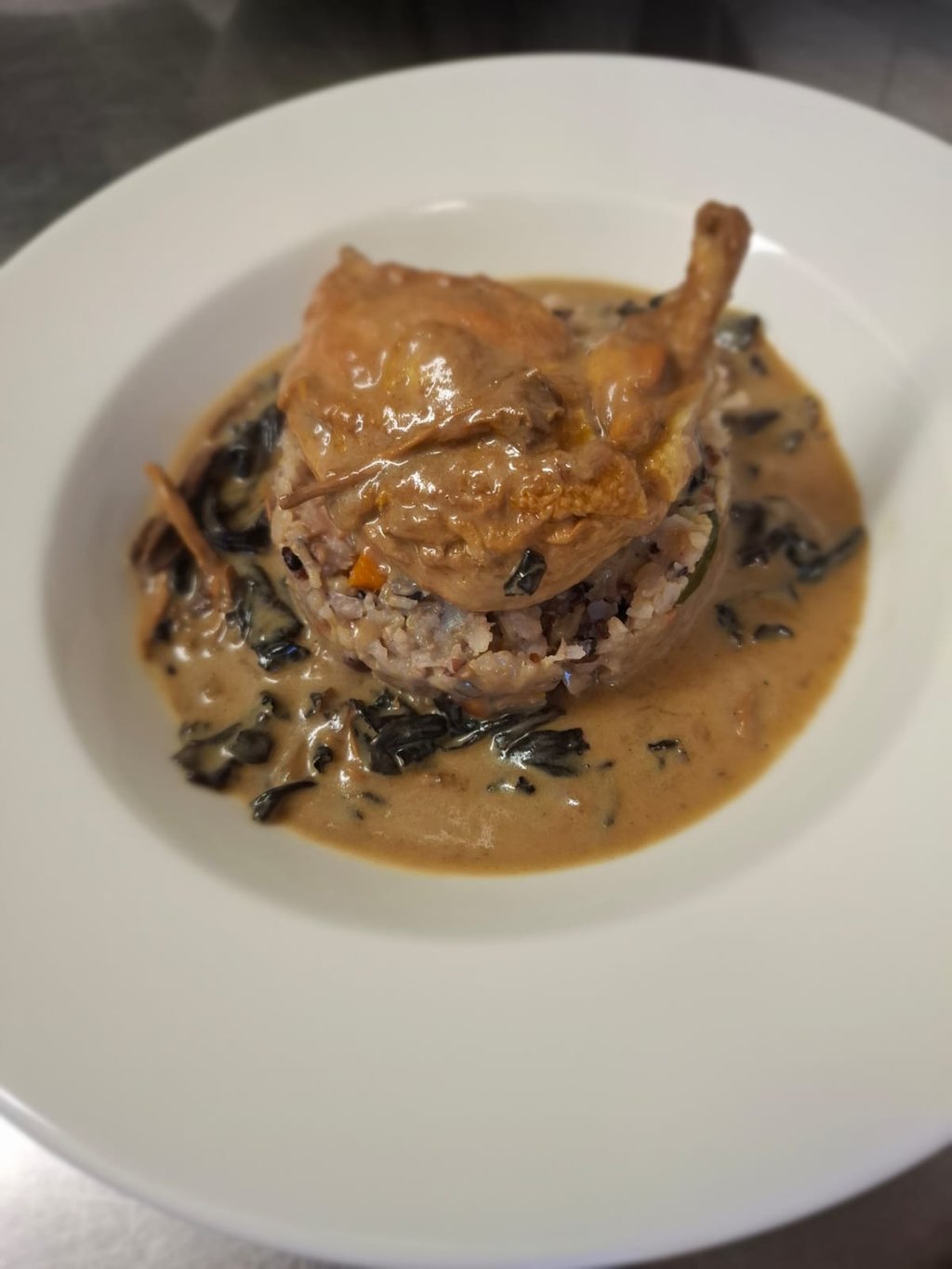 Sauce crémée aux champignons, 3 riz de Camargue pilaf aux carottes & courgettes