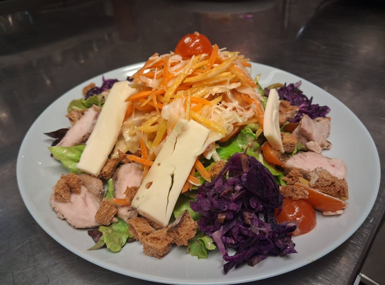 Porc confit, chou blanc, chou rouge vinaigré au lard, tomate cerise, carotte, tomme & croûtons
